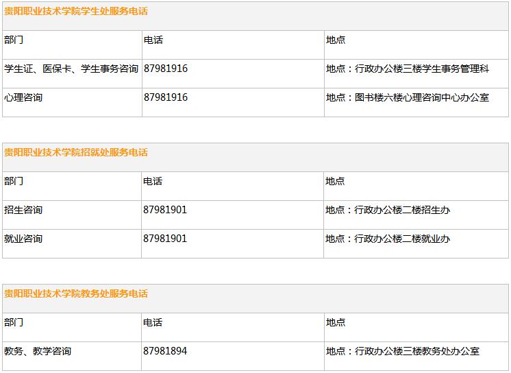 高等职业教育作为一种不同于普通高校的教育类型,决定了高职院校的社会服务有其自身的特点。只有以科学发展观为指导,对高职院校的社会服务进行科学准确的定位。下面是贵阳职业学院的一些服务电话,同学们如果有需要可以记下来哟。希望能帮到你。